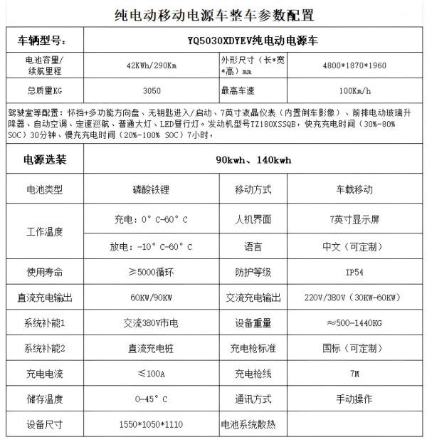 本车型是由永强能达和小夫充电共同研发的一款纯电动应急电源充电车车,本车规格可选配90KWH/60KW与140KWH/90KW,无需分离设备购买。本车可接入各平台(如互充充/E打电等),精准匹配客户需求。
