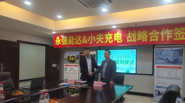 签约现场,红色横幅“永强能达&小夫充电 战略合作签约仪式”高悬会场,电子屏滚动播放合作愿景,双方代表握手合影