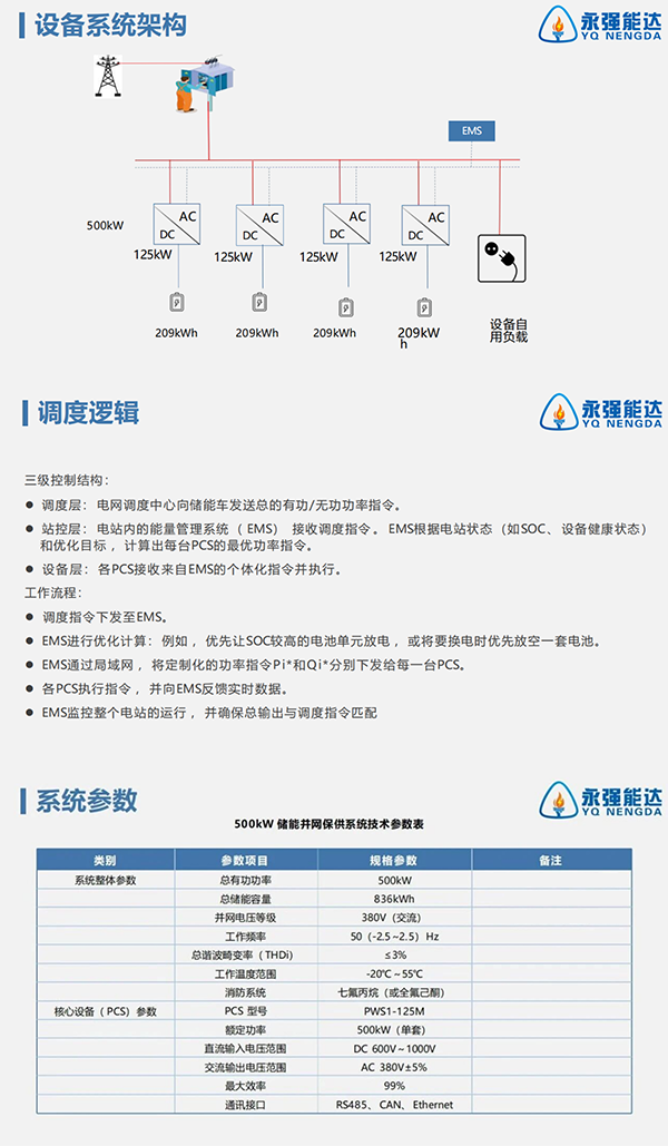 500KW移动储能车是由永强能达和永强汽车联合打造为并网应用场景开发的高安全、高可靠产品。车辆底盘采用汕德卡短轴距4*2底盘,装配一体式储能厢体,扩容灵活,适应城区保共用电作业等多种场景应用。储能系统采用集成及预装式设计理念,其系统具备电网电压调节、三相不平衡治理、谐波治理等功能,可提升电能质量、负荷跟踪、备用电源削峰填谷等功能。可实现企业降低能用成本,增加绿色能用等。